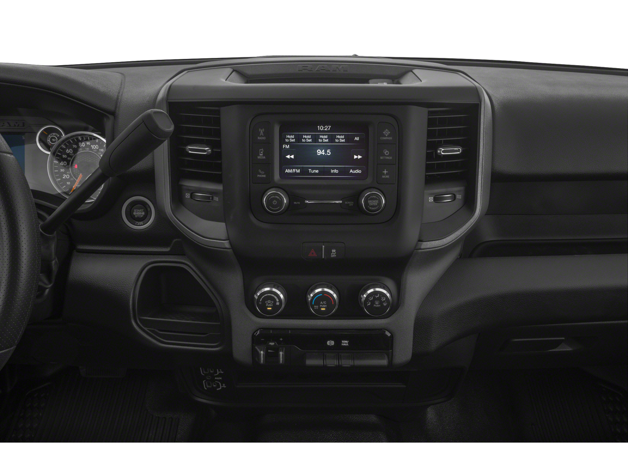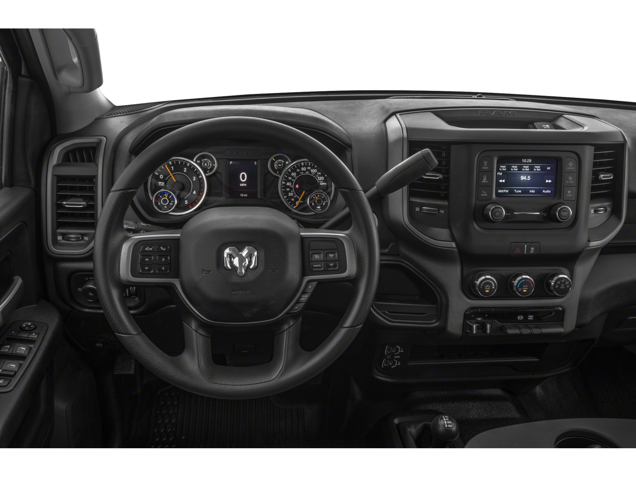 Chrome Appearance Group (Bright Front Bumper, Bright Rear Bumper, Center Hub, Chrome Grille Surround, Matte Black Mesh Grille w/Chrome, and Wheels: 18 x 8.0 Steel Chrome Clad), Heavy Duty Snow Plow Prep Group (220 Amp Alternator), Quick Order Package 2GA Tradesman, 17 x 7.5 Steel Styled Wheels, 2 Way Rear Headrest Seat, 3.73 Axle Ratio, 4 Way Front Headrests, 4-Wheel Disc Brakes, 40/20/40 Split Bench Seat, 4G LTE Wi-Fi Hot Spot, 6 Speakers, 8.4 Touchscreen Display, ABS brakes, Active Noise Control System, Air Conditioning, All R1 Low Radios, All Radio Equipped Vehicles, AM/FM radio, Apple CarPlay, Black Exterior Mirrors, Bluetooth® Handsfree Phone & Audio, Brake assist, Cluster 3.5 TFT Color Display, Compass, Connectivity - US/Canada, Delay-off headlights, Driver door bin, Dual front impact airbags, Dual front side impact airbags, Electric Shift-On-The-Fly Transfer Case, Electronic Stability Control, Electronically Controlled Throttle, Emergency communication system: SiriusXM Guardian, Exterior Mirrors Courtesy Lamps, Exterior Mirrors w/Heating Element, Exterior Mirrors w/Supplemental Signals, For Details, Visit DriveUconnect.com, Front anti-roll bar, Front Center Armrest w/Storage, Front License Plate Bracket, Front reading lights, Fully automatic headlights, Global Telematics Box Module (TBM), Google Android Auto, GPS Antenna Input, Heated door mirrors, Heavy Duty Vinyl 40/20/40 Split Bench Seat, Illuminated entry, Integrated Center Stack Radio, Integrated Voice Command w/Bluetooth®, Low tire pressure warning, Manual Adjust 4-Way Driver Seat, Mirror Running Lights, MOPAR Spray In Bedliner, Occupant sensing airbag, Outside temperature display, Overhead airbag, Overhead console, ParkView Rear Back-Up Camera, Passenger door bin, Passenger vanity mirror, Power Adjust & Heated Black Tow Mirrors, Power door mirrors, Power steering, Power windows, Radio data system, Radio: Uconnect 3 w/5 Display, Radio: Uconnect 5 W w/8.4 Display, Rear anti-roll bar, Rear Folding Seat, Rear step bumper, Selectable Tire Fill Alert, SiriusXM Radio Service, SiriusXM Satellite Radio, Speed control, Storage Tray, Tachometer, Tilt steering wheel, Tip Start, Traction control, Trailer Brake Control, Trailer Light Check, Trailer Tow Mirrors, Variably intermittent wipers, Vendor Painted Cargo Box, Vendor Painted Cargo Box Tracking, and VoltmeteR.